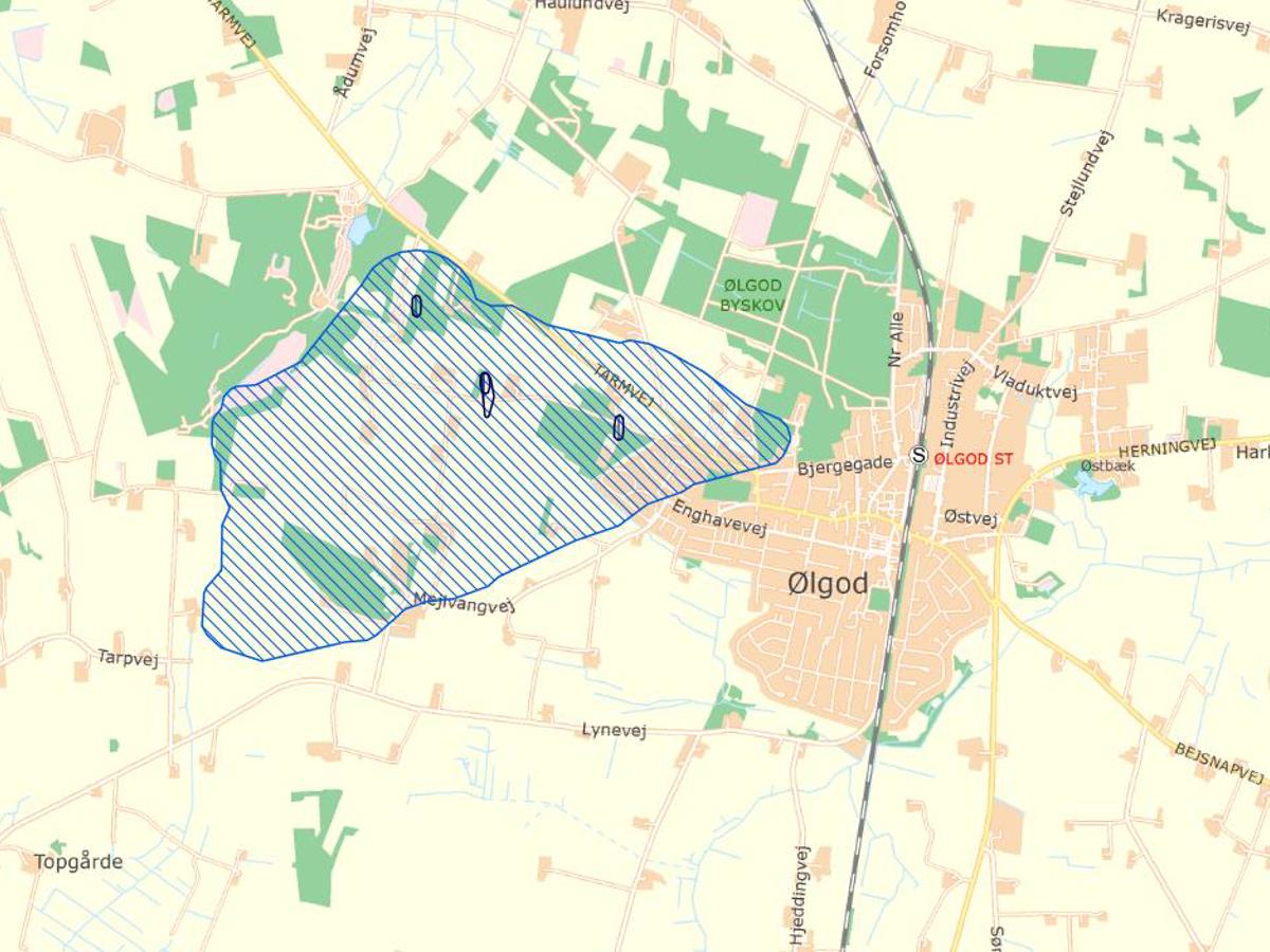 På nedenstående kort ses indvindingsoplandet til forsyningsområde Ølgod. Indvindingsoplandet er et OSD-område (område med særlig drikkevandsinteresse). De 3 mindre blå polygoner i OSD-området angiver BNBO områderne (Boringsnære beskyttelsesområder).