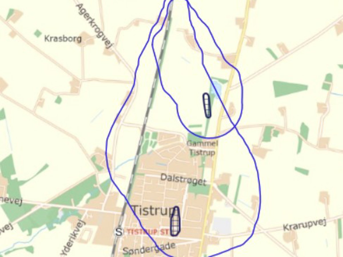 På nedenstående kort ses indvindingsoplandet til forsyningsområde Tistrup. Indvindingsoplandet er et OSD-område (område med særlig drikkevandsinteresse). De 2 mindre blå polygoner i OSD-området angiver BNBO områderne (Boringsnære beskyttelsesområder).